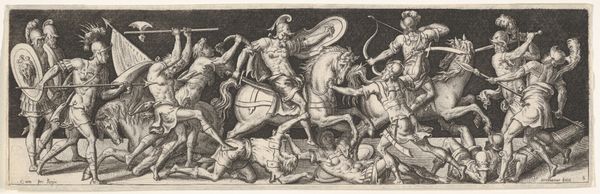 Etienne Delaune created this print, "Plate from Battles and Victories," sometime in the 16th century. The linear design compels the eye across a panorama of combat. It evokes an emotional response through its complex composition and the dynamic interplay of figures in conflict. Delaune masterfully employs the technique of engraving, emphasizing line and form to create a highly detailed, energetic scene. Here, the battle isn't just a historical representation, it's a structured narrative. Each figure, each weapon, and each gesture acts as a sign, contributing to a larger symbolic order. The print challenges fixed meanings of heroism and valor, instead presenting a fluid, chaotic space where victory and defeat are intertwined. Notice the balance and tension between order and chaos in this work. It invites us to see art not as a reflection of reality, but as a complex structure of signs and meanings, open to continuous interpretation.