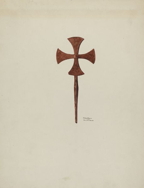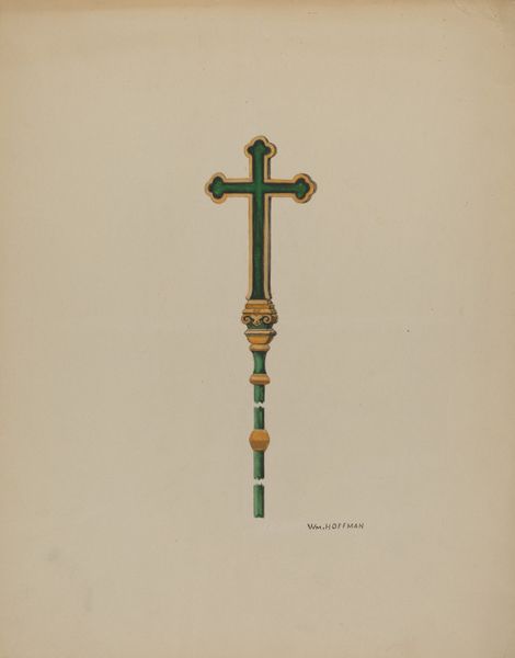 Curator: Here we have Kurt Melzer's "Cross," created around 1936. It's a drawing, using pencil on what appears to be paper, depicting a metal cross design. Editor: It feels austere, doesn’t it? The muted tones of the pencil sketch contribute to this sense of severity, despite the delicate details incorporated into the design of the cross. The form, particularly that circle bisecting the vertical element, really captivates my eye. Curator: That central circle immediately brings to mind the halo often depicted in religious iconography, particularly when associated with Christ. It also reminds one of the sun as a symbol of rebirth or eternity. Editor: I’m particularly interested in how the cross structure interacts with the page; how the other sketches emphasize the artwork's industrial nature. Its materiality—as something constructed of metal, rather than floating ethereally—grounds the image in the practical. Curator: Metal itself carries a significant symbolic weight, from protection and strength to being a material often associated with alchemic transformation. Its use here as a symbol for Christian faith adds layers of interpretation to its meaning, doesn't it? Editor: Definitely. But also, consider the architectural drafting feel of the rendering—the notations for 'actual size' and scale. This distances it from the deeply spiritual weight of the cross itself, instead becoming a beautiful pattern for something practical, not an emotional totem. The overall impression becomes muted and measured because of it. Curator: It speaks to the intersection of faith and craft, highlighting how spiritual ideas become manifest in the tangible world. Editor: I agree. The dialogue between these worlds - form and function, symbol and sketch - elevates it beyond the purely representational. The work embodies transformation, as it balances both utility and grace. Curator: Indeed. Reflecting on it further, the beauty emerges not only from the intended function but from this fascinating juxtaposition of artistic and utilitarian intent, drawing together spirit and physical labor in an enduring image.