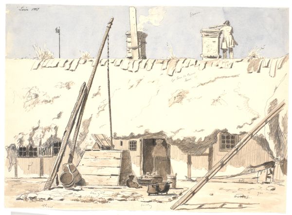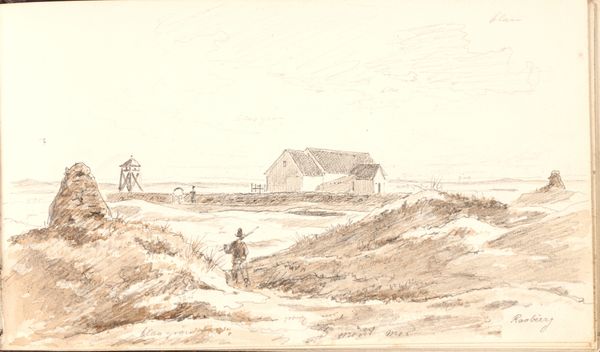 Editor: This drawing from 1848, titled "Fishermen's Cottage in Skagen Østerby, with the white lighthouse in the background," by Martinus Rørbye, uses pencil on paper. The subdued tones and meticulous details almost make it feel like I'm peering through time itself. What stands out to you when you observe the formal aspects of this work? Curator: The most compelling aspect is Rørbye's masterful command of line and tonal variation. Notice how the varying densities of the pencil strokes delineate the forms, creating depth and texture. The composition, with its careful arrangement of geometric shapes, underscores a dialogue between man-made structures and the natural landscape. Do you see how the diagonal thrust of the fishing boat’s mast contends with the static verticality of the lighthouse in the distance? Editor: Yes, that tension is certainly present. The leaning mast juxtaposed with the straight lines of the lighthouse creates visual interest. What does this contrast evoke? Curator: It elicits a study of equilibrium, not necessarily resolved but visually dynamic. The subtle gradations across the paper – from the deep shadows around the cottage to the faintest of horizon lines – create an intricate play of light. One might consider how the artist renders a narrative, perhaps on human presence in a challenging terrain, purely through formal arrangement. What does the artist do to use the formal elements to create a certain depth of space and visual layering? Editor: Well, I think the detail given to the cottage, versus the background elements which are much less defined, pushes the cottage into the foreground, making the image more dimensional. I find it quite compelling that, with only a pencil, he was able to convey so much detail and emotion in a fairly minimalist image. Curator: Indeed, a very perceptive reading of line and form creating an immersive pictorial experience.