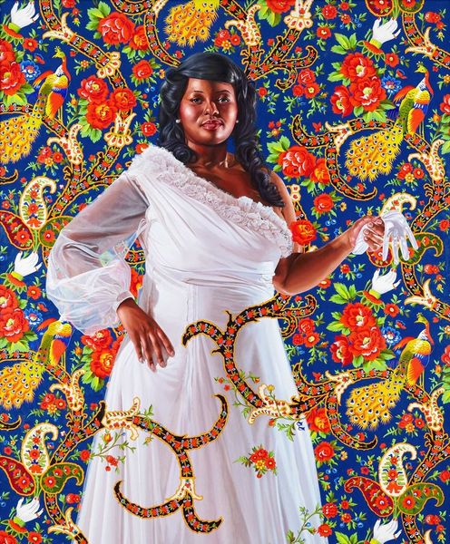 Kehinde Wiley made Mary Litte, Later Lady Carr, using oil on canvas. Look how the light glazes across her face! Wiley's use of color is bold but also subtle; there are so many reds and browns in her skin, blending together to create a natural, luminous effect, its beautiful. The paint application here is interesting. It’s smooth, almost polished, in contrast to the dense, busy background. The background pattern is so flat and decorative, it pushes forward and emphasizes the depth in the figure’s face. Notice that the honeysuckle that she holds in her hand seems to overlap the dress, the wallpaper, almost as if it were a part of the pattern. The honeysuckle and leaves curl around her body, binding her to the background and reinforcing this dialogue between flatness and depth. Wiley is a contemporary artist who builds on a deep knowledge of art history; I’m reminded of artists like Klimt who also merged the figure and decorative background.