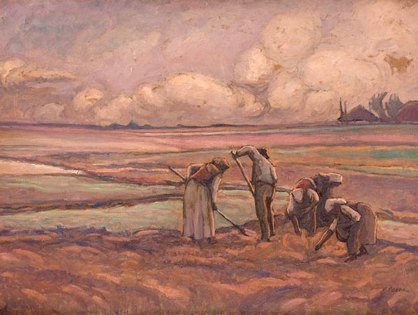 Jules Breton created this small oil on panel, "Women spinning near a shrine on the edge of a field," most likely in France during the mid-19th century. It depicts women engaged in the traditional craft of spinning, set against the backdrop of a rural landscape punctuated by a roadside shrine. This image creates meaning through its depiction of peasant life, common among the Barbizon school painters and the Realist movement. Breton, though, idealized rural life, focusing on its timeless qualities rather than the social disruptions of urbanization or the effects of class division. The shrine in the painting speaks to the importance of religion in the daily lives of rural people. To fully understand this artwork, we can look at the rise of academic art institutions in France, the development of Realism as a painting style, and the changing social role of women during the industrial revolution. Ultimately, the meaning of this painting is tied to its historical and institutional context.