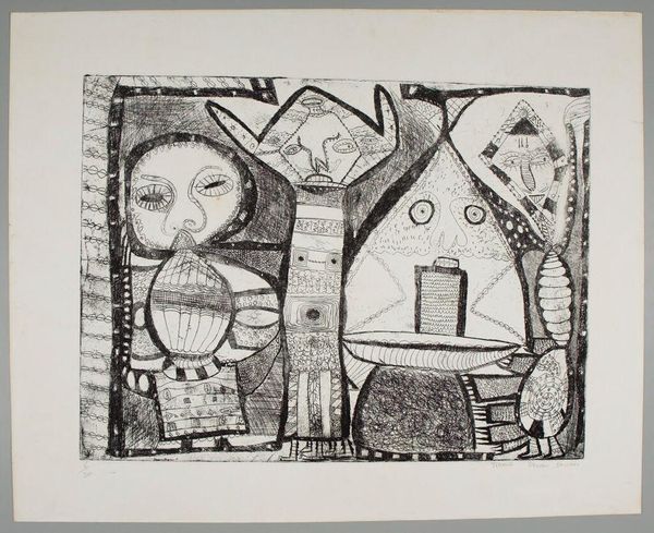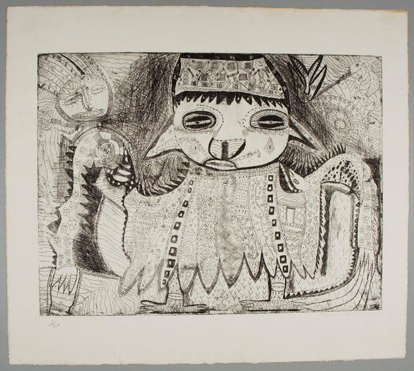 Editor: So, this is Twins Seven Seven’s "Composition with Winged Figure," printed at an unknown date. It looks like ink on paper, and the composition is so intricate. How might this piece be interpreted within its cultural context? Curator: It's tempting to view this as a window into Yoruba cosmology. Seven Seven emerged during a politically charged period in Nigeria. How might his embrace of Yoruba mythology also function as a subtle form of cultural assertion? Editor: That’s fascinating! I hadn’t considered the socio-political aspect. Curator: Art is rarely created in a vacuum. Think about the role of museums in shaping our understanding of African art during this time. Were they primarily focused on ethnographic display, or were they embracing contemporary African artists? Editor: I guess I hadn't thought enough about what museums chose to exhibit. Curator: Exactly. And who benefits from those choices? Looking deeper is the key!