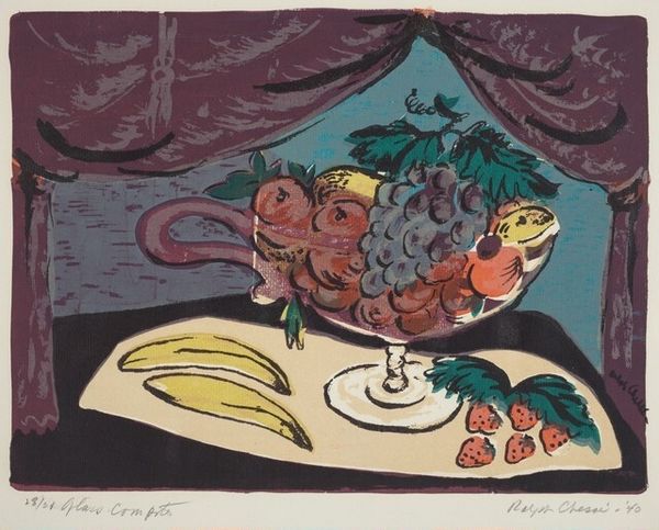 Curator: What a peculiar scene, a muted color scheme but intriguing composition. Editor: This is Henry Mark's "The Table," a print created in 1941. It’s ostensibly a still life, but the more I look at it, the more I see a commentary on domestic labor. Curator: I see that, yes. Look at how the table itself is rendered, though—the artist uses this slightly skewed perspective, and the color choices flatten the space. Notice also the planes created through color contrast, challenging our sense of depth. It all leads to a captivating tension on a formal level. Editor: Absolutely. And think about the materials themselves—the ink, the paper—and how their production and distribution were impacted by the social climate of the time, just on the cusp of World War II. These seemingly everyday objects on the table represent availability, the act of procuring them. Curator: That muted palette you pointed out, it enhances that quiet tension as well. These aren't the vibrant, celebratory colors of a joyful still life. It's all a bit restrained, formal almost. I see also echoes of cubism and early modernism through the lens of the mid-century. Editor: Restrained yes, which I find powerful. The items depicted are readily available but perhaps a privilege during a war. Consumption under these circumstances speaks volumes, it’s almost a recording. The process involved, the choices, they tell us something of a daily life—which becomes quite profound. Curator: So, while I see an engagement with formal experimentation, you find a socioeconomic commentary? Editor: Precisely. It is this interrelation between these concerns that elevates the piece beyond simple visual exercise into historical record. Curator: A thoughtful and complex piece, no matter how one chooses to view it. Editor: A great artwork always contains layers.