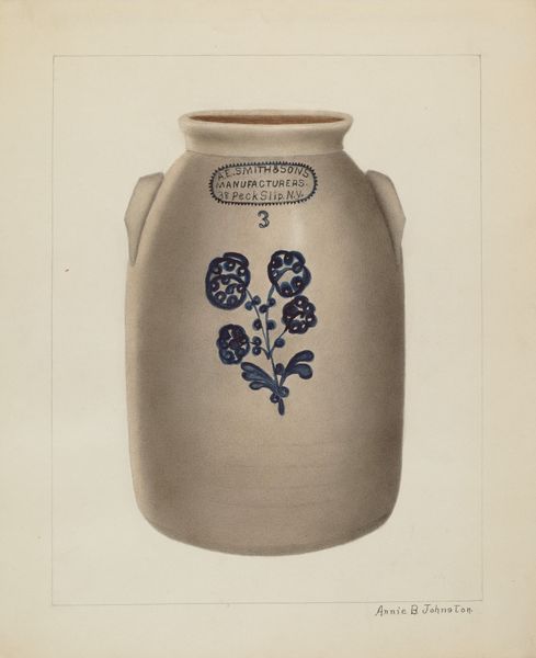Frank Fumagalli made this drawing of a churn, we think, sometime in the twentieth century. There's a real tenderness in the way Fumagalli uses color, sticking to these muted browns and blues. You can tell he’s thinking about how the image comes together, almost like he’s trying to coax it into being. Looking closely at the churn's surface, I see that Fumagalli doesn't hide the process. The paint is thin in places, letting the paper peek through. Those dark blue flowers are almost like explosions of color, each with its own energy. And notice the little dots trailing from the central blossom? They feel playful and free, almost like an afterthought, but they add so much life to the whole piece. It reminds me a bit of some folk art I've seen, where there's this unpretentious honesty in how things are depicted. It's not about perfection; it's about capturing the essence of a thing. And that, to me, is what art's all about: embracing the messiness and finding beauty in the unexpected.