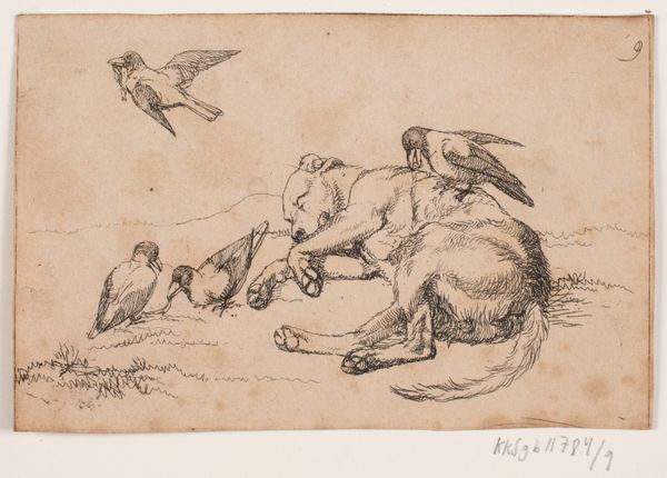 Curator: This engraving, crafted before 1892 by de Groot, is titled “Vijf kaketoes zittend op een boomtak”—“Five Cockatoos Sitting on a Branch.” Editor: Ah, a flock of feathered philosophers, it seems. There’s something rather melancholic about this grouping—they're huddling together as though warding off a chill, maybe even a deep existential dread. The texture gives it this quality; they appear almost vulnerable in their detailed rendering. Curator: The cross-hatching gives the piece such incredible depth! You can practically feel the roughness of the branch they perch upon. And consider the implications of depicting cockatoos – a species so often commodified and caged – in the context of late 19th-century colonialism and the exoticization of the "other." Editor: That’s a strong point. These aren't simply birds; they become potent symbols of displacement, alienation, and the disruption of natural habitats, even though the branch gives a strong grounding and safety from being too exposed to the outside environment. Are they aware of it, are they happy with it, or not. The choice of a seemingly objective realistic style doesn’t obscure these interpretations. The piece also feels unfinished in a way— intentionally or unintentionally making it that much more contemplative. It lacks some details of completion, just the way colonial times felt to natives, and still do. Curator: It almost seems like Groot invites us to consider these birds’ own perspectives on their surroundings – if indeed they’re still “surroundings” and not enclosures by the time this drawing comes to be. This piece makes you feel a certain disquiet – a discomfort in observing that shifts our perception towards something bigger. We go from simply seeing a drawing to questioning the reality. Editor: And, there's this palpable sense of collective consciousness – they share something. As birds that travel in a flock, you feel this communal sense of responsibility as one body on one shared goal. The way de Groot depicts this consciousness speaks of so much pain, that translates to their displacement during those periods in time. Their feathers feel a certain darkness about it as if reflecting this internal trauma. It’s beautiful, even painful, that you get the emotions of collective consciousness here through what is depicted in this drawing. Curator: This work reminds us to see the world not just from our human viewpoint, but through the experiences of creatures whose lives are deeply entwined with our own histories. Thank you. Editor: A sobering thought, rendered with surprising intimacy and tenderness. The silence these birds invite is actually screaming at a deep existential trauma. Something very haunting lingers there.