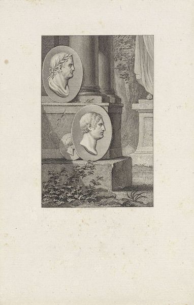 Editor: Here we have an engraving, "Medaillons met portretten van Alexander de Grote en Julius Caesar op een pilaar," dating roughly between 1789 and 1809, by Reinier Vinkeles. The depiction of classical leaders on a dilapidated pillar gives a somber, almost nostalgic feeling. What do you see in this piece, particularly in terms of its historical context? Curator: This engraving is deeply embedded in the Neoclassical revival that swept through Europe. Notice how Vinkeles presents Alexander and Caesar not merely as portraits, but as medallic forms adorning a classical column. This isn't just about admiring antiquity, but about invoking the authority and grandeur of those historical figures to legitimize contemporary political and social structures. Editor: So, it’s not simply a historical record but more like… political propaganda through art? Curator: Precisely. The choice to portray Alexander and Caesar, both figures associated with empire and strong leadership, is deliberate. This artwork exists within a landscape of political upheaval, where ideas about governance and leadership were being fiercely debated. Also, consider how accessible engravings were. They were reproducible, easily disseminated and aimed to instill certain values among a wider audience, therefore fulfilling a public role. Do you see the crumbling nature of the pillar? Editor: Yes, it almost feels intentional... like a reminder of the ephemeral nature of power. Curator: Indeed! It suggests that even empires and their leaders eventually fall. That creates a fascinating tension; are we meant to simply admire or also reflect on the impermanence of power? This highlights how art becomes a space to negotiate complex social and political ideas. Editor: This piece speaks volumes about the complex relationship between art, power, and public perception during that period. Thank you! Curator: A stimulating conversation, considering how art serves as a window into the politics and public life of its time.
