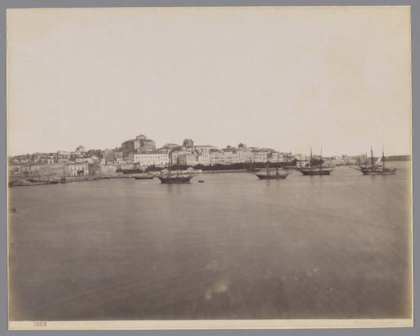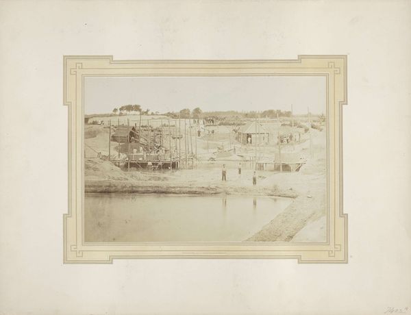 Curator: I'm immediately drawn to the stillness in this image, a gelatin silver print. There’s something quite serene about it. Editor: Let's contextualize that initial reaction. We are looking at an image titled, "Gezicht op de kades, scheepshellingen en gebouwen van de Singapore slipway and engineering Company Limited in Tanjong Pagar," attributed to G.R. Lambert & Co., dating from before 1905, and currently held at the Rijksmuseum. Curator: And knowing the title enriches the viewing experience! The subdued tonality certainly reinforces that calmness. How does the interplay of water, sky, and industrial structures speak to you, formally? Editor: Formally, the photographer used the wide expanse of water to emphasize the structures on the shore. The composition highlights the scale of the Singapore Slipway, showing the industrial intervention in this landscape, the very human act of shaping resources and landscape for enterprise. What kind of labor do you imagine occurring in this place, prior to the widespread development of this technology? Curator: It’s intriguing to think about. I mean, photographs from this era, presented often as detached observation, invariably served the goals of empire. This photo served as visual evidence of colonial enterprise. Note that by naming the engineering company within the very title of this work, we are observing labor in a specifically capitalistic moment of industry. Editor: The medium of photography plays its role, doesn't it? The gelatin silver print—how does that affect your viewing? Curator: The silver gelatin printing process itself lends to the perceived realism and “objectivity." It solidified the Western view of labor. I think that impacts its aesthetic reading even today, and how that links to capitalism in a new historical period of globalization. The sky feels hazy. It makes me think about environmental impact and consumption even back then. Editor: Interesting observation; perhaps an early consciousness toward industrial labor's negative affect. Though not immediately present in the crisp image, that sense of environmental degradation is haunting to discover. Curator: It changes the mood and the composition once you know its name and production place. Editor: Indeed. Visual analysis only gets us so far; it's the connection to labor and materials that truly gives the photograph meaning.