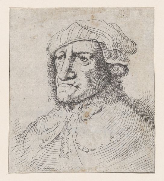This self-portrait was etched by Georg Strauch in the 17th century, using fine lines to create a detailed image. At first glance, you are struck by the contrast between the densely etched background and the comparatively lighter treatment of the face. The composition draws attention to the sitter's face, framed by a fur hat and long hair, both rendered with intricate textures. The use of hatching and cross-hatching defines form and shadow, giving depth to the figure against a subtly textured backdrop. Strauch's etching technique embodies the philosophical spirit of the era. The meticulous detail and structured lines reflect a world seen through a lens of order and reason, characteristic of the burgeoning scientific thought that aimed to classify and understand the natural world through observation and categorization. This work invites us to consider how self-representation can be both a personal and a deeply structured act.