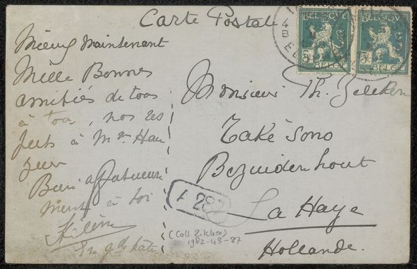 Editor: This is a photograph of a postcard titled "Brief aan Philip Zilcken," predating 1931. It seems to be ink on paper, a handwritten note with a stamp. It feels intimate, a glimpse into a personal exchange, but also somewhat mysterious due to the faded script. What symbols or meanings do you see layered within this piece? Curator: The faded ink itself becomes a powerful symbol, doesn't it? It speaks to the passage of time, of words sent and received long ago. Note the stamp – a clear emblem of Belgian identity and the early 20th century. Think about what a handwritten note *meant* then. It signified commitment. The flowing script suggests personality, urgency even, qualities often absent in our digital communications today. Editor: That's true, the handwriting adds a layer of humanity that's easily lost now. The address, "La Haye," and the sender's name also suggest something about the social circles of these individuals, correct? Curator: Precisely. Consider the context: 1912, just before the outbreak of the First World War. Europe was on the brink. This simple postcard then carries a deeper weight – a snapshot of a world about to be irrevocably changed. Is the message itself just everyday banter, or does it hold secrets, anxieties about the imminent future? It begs so many questions. Editor: I hadn’t considered the pre-war context, that completely changes the mood for me. I see the ordinariness, like a little moment of connection against a backdrop of global turmoil. Curator: And that's the power of art, isn't it? It's not just about what is presented, but also about the historical and cultural memories that it evokes. Every detail tells a story if we pause to listen. Editor: Absolutely. This brief postcard now seems infinitely more complex. Thanks, I learned a lot from your reading.