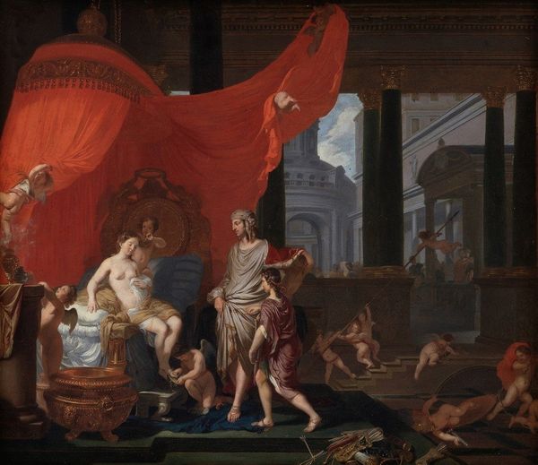 Curator: "Theseus Finding his Father's Sword and Sandals" by Jean Lemaire offers a glimpse into a classical narrative, rendered in oil paint sometime between 1612 and 1659. Look closely at the characters amidst the crumbling architecture. Editor: My immediate feeling is one of melancholic grandeur. There’s such weight in the stone, in the history visibly collapsing. The palette reinforces a kind of subdued heroism against a backdrop of decay. Curator: Lemaire’s career was profoundly shaped by his time in Rome, reflected in his focus on architectural painting. He joined the painters circle, which connected artists to an international elite of patrons. The painting highlights an era grappling with antiquity. How should its forms be studied or utilized? What did the classical era mean for 17th century European society? Editor: And you see that wrestle with antiquity so clearly here – the picturesque ruins serve as a backdrop but are juxtaposed with the rather romanticized figures in the foreground. This painting really encapsulates an almost performative construction of identity through classical symbolism, especially male identity and its association with power. It begs the question: who gets to claim this legacy, and how does it reinforce existing hierarchies? Curator: Absolutely. The rediscovery of classical texts and the excavation of Roman ruins deeply impacted artistic production. Consider how these elements served as visual propaganda for burgeoning nation-states eager to associate themselves with the perceived glory of the Roman Empire. Paintings like these contributed to the construction of national narratives and cultural prestige. Editor: And isn't it also interesting to consider the power dynamics embedded in the scene? The almost allegorical figures hinting at power – Theseus on a path of kingship by revealing the tools left by his father, king Aegeus. This myth reinforced notions of patriarchal inheritance, dominance, and the right to rule, cloaked in the alluring garb of classical heroism. Curator: Examining such paintings in public collections like the SMK compels us to think critically about art's public role. Whose stories are valued? How are these narratives shaped, preserved, and disseminated by cultural institutions? Editor: This painting highlights that interplay between individual heroism, political ambition, and the enduring, yet often selectively interpreted, allure of classical history. These narratives, framed by grand landscapes and decaying empires, continue to echo through our present, prompting questions about who benefits from the stories we choose to tell and how they influence our contemporary realities.