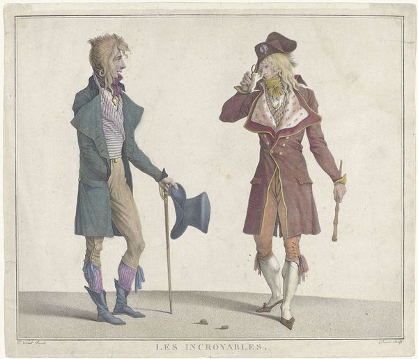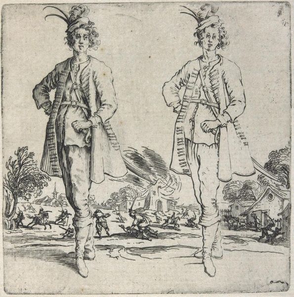 Curator: Here we have "Tweemaal dezelfde soldaat met kleine gepluimde hoed en de hand in de zij, van voren gezien" or "Two times the same soldier with a small plumed hat, hands on his side, seen from the front." This engraving, dating roughly from 1621 to 1657, is by François Collignon. The Rijksmuseum houses it. It’s striking, isn't it? Editor: My first thought is confidence. The soldier's stance is replicated side by side in these meticulous lines, exuding a sense of pride or perhaps even defiance. The Baroque detailing in the clothing makes quite an impression. Curator: The duplication immediately raises questions about identity and representation. Is Collignon commenting on the role of the individual within the military, perhaps hinting at the interchangeability of soldiers? We must consider the societal function of military might in this historical and social framework. Editor: Symbolically, I am curious about the plumes, the way the hat sits askew. Plumes were a popular, decorative status symbol through centuries in diverse cultures: were these Collignon’s personal touch? Perhaps Collignon is offering insight to Baroque fashions as visual culture here? Curator: And does that adornment point to broader issues of masculinity and performativity? Collignon provides space for discussion about how one occupies and presents a particular body, and within the historical narratives of military power, this has implications for our contemporary dialogues around the very nature of representation. Editor: Absolutely. The sword and the carefully rendered boots, are emblems. But it seems his confidence or swagger becomes the most memorable part of this cultural memory through his emblems: those symbols endure beyond the individual portrayal here. It allows us, even centuries later, insight on the role of soldier within social-cultural expectation. Curator: By placing this image of militarism into conversations about broader representation, maybe we can begin to destabilize historical hegemonies to imagine newer configurations. Editor: I agree completely: and through his details, he is also communicating how the ephemeral nature of culture and confidence can extend across generations in powerful form.