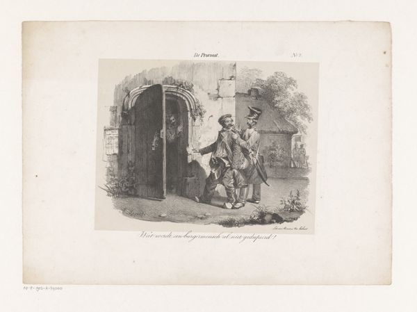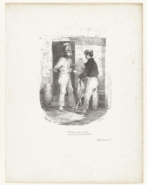 Curator: This drawing, attributed to Auguste Raffet and dating from the 1820s, is titled "Jean-Jean met een emmer water om schoon te maken," or "Jean-Jean with a bucket of water to clean up." It resides here at the Rijksmuseum. What's your initial impression? Editor: Well, there’s a slightly unsettling atmosphere here. While the scene depicts what looks like everyday cleaning duties, the expressions are oddly stiff, almost caricatured, creating a sense of societal critique rather than simple genre painting. Curator: Precisely. I think that's what lends it the staying power of romanticism even in a common theme of everyday workers, drawn using pencil and graphite. The repetition of figures, their uniforms, perhaps speaks to forced labor or service. The water bucket is just the surface. Editor: Indeed. The bucket itself is placed strategically at the periphery of our central figures. This highlights the societal message over a story or personality-centered experience. This aligns well with my historical research of this era, as public order and its visual display became increasingly centralized concerns. How were workers perceived and depicted? This drawing contributes to that evolving visual culture. Curator: The "Jean-Jean" in the title then takes on another layer of meaning—could this refer to a generalized worker figure rather than an individual? If so, does that affect its significance beyond a simple genre scene? Editor: Absolutely, it pushes the drawing into the realm of social commentary. It encourages the viewer to ask why Raffet chose to depict this particular scene and to consider what social forces might be at play. Also, it would be useful to research Raffet's circle—did he share similar political and social perspectives? Curator: It raises the question: Is he sympathetic to this “Jean-Jean” character? Or is it an observational piece void of sentimental empathy? These romantic undertones and this approach would explain the ambiguity of his position through powerful imagery. The figures, their poses—it’s all very deliberate. Editor: So, this modest drawing actually holds a mirror up to societal perceptions and the politics surrounding labor in the early 19th century. Curator: Precisely. This allows us to see the visual representations and hidden social narratives of the working class—their service, suffering, and the societal structure. Editor: A fantastic intersection of art and social history, demonstrating how everyday images can unveil complex truths about our past.