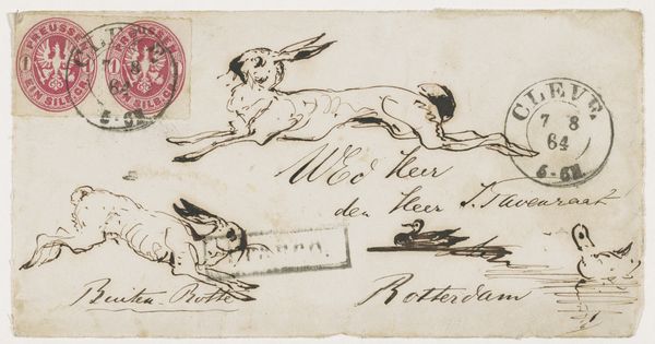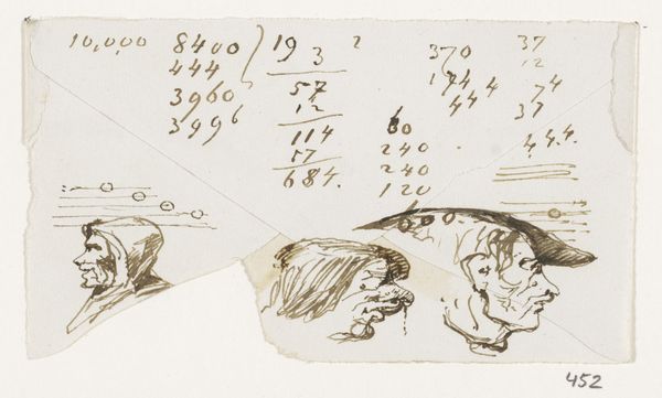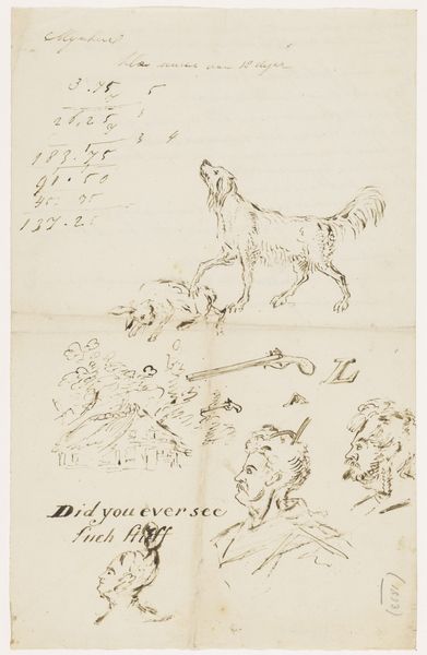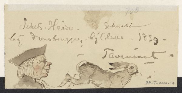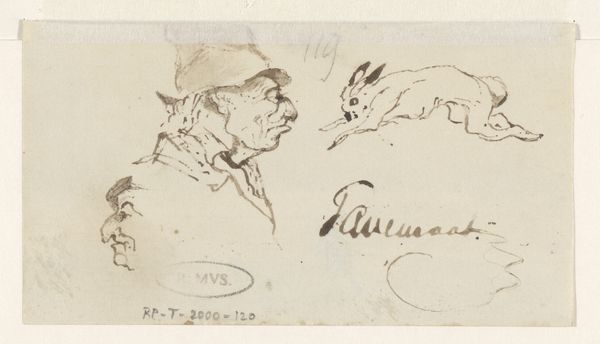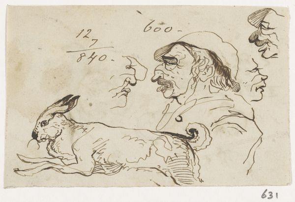 Editor: Here we have "Two Heads and Two Hares" by Johannes Tavenraat, a pencil drawing on paper created sometime between 1840 and 1880. It strikes me as an informal sketch, almost a doodle page. What compositional elements stand out to you? Curator: Note the deliberate deployment of line and form, irrespective of subject. See how the artist contrasts the more fully rendered hares with the mere suggestion of human countenances above. The proportional relationships within each grouping present internal geometries and rhythmic qualities. Editor: So you're less concerned with what the figures *are* and more with how they are *depicted*? I confess I’m drawn to try to interpret what the artist might have been thinking. Curator: Such inquiries are extrinsic to the artwork. Consider instead the intrinsic formal properties. Observe the stark contrast of light and shadow. Note the use of hatching and cross-hatching to build depth. It is an orchestration of dark and light tones and mark making, and a display of tonal range within a restricted palette. Editor: It is interesting how you phrase that. I keep wanting to link it to Romanticism because of the animal theme. I suppose it is a leap. Curator: Perhaps. The pencil strokes and composition generate meaning independent of historical associations, as their configuration creates rhythm. Observe how the upward-pointing ears are opposed by the forward motion of the hares' bodies. Editor: I see. I was approaching it looking for narrative and context but appreciate seeing this emphasis on the visual language itself. Curator: Exactly. Focus on the structure and relationships, and the artwork reveals itself on its own terms. Editor: Thank you, that clarifies a whole other way to approach art, to see it primarily as a structured arrangement.