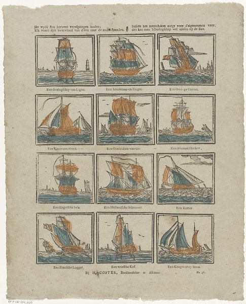 Curator: This print, created by George Lodewijk Funke between 1865 and 1875, is titled "Geschiedenis der scheepvaart," or "History of Shipping." Editor: Wow, what a visual feast! It reminds me of a quirky stamp collection—so many little boats all neatly lined up. Kind of charmingly obsessive, wouldn’t you say? Curator: Absolutely. It’s fascinating how the print attempts to represent the progression of watercraft over time. We see a clear attempt to showcase various vessel types, from rudimentary rafts to more sophisticated sailing ships. I would also observe that the artist’s reference to “Kinderprenten” speaks to a potentially didactic purpose to be examined in relation to then-contemporary education. Editor: It definitely has that textbook vibe, doesn't it? But look closer—some of those early boats are just hilarious. People clinging to logs! It really highlights humanity’s tenacious spirit of getting around no matter what. And hey, the Roman galley looks suspiciously like a floating swan, no? I mean, did they actually glide around like that or did the artist maybe took some… liberties? Curator: Indeed! In its visual narrative and potential distortion, this work offers an opportunity to consider how historical representation is intertwined with artistic license, and to question whose history and whose visual culture we are really seeing. One might investigate further how the visual rhetoric constructs notions of "progress" linked with Western modes of transportation in relationship to the selected subjects. Editor: Right! It makes you wonder what Funke considered 'advanced' or 'important' enough to include. What narratives are we *not* seeing here? But on a more personal note, these detailed engravings are just gorgeous, such fine linework! I feel like grabbing my sketchbook and trying my own history-of-cupcakes chart. Curator: I see your impulse there—and Funke’s print encourages this act of personal reflection and revision. It also serves as a potent reminder that art can function as both a reflection of societal values and a subtle instigator of critical dialogue with history. Editor: Absolutely! This little print makes you think big time, eh? Like where we have been, where are we going and can my next vehicle resemble floating swan... That’s art at its best!