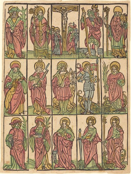 These "Bidprentjes," or prayer cards, were created by Johann Peter Wolff using an etching technique. The composition consists of eight rectangular frames arranged in a grid, each depicting scenes from the life of Saint Thecla. Notice how Wolff employs repetition and symmetry, reinforcing the idea of a structured, ordered world. Each frame is carefully delineated, using sharp lines to define figures and settings. The limited color palette of earth tones creates a sense of sobriety, perhaps intended to evoke piety and devotion. The cards' structure reveals how religious narratives are often constructed through a combination of symbols, gestures, and settings. For instance, the halo consistently marks Saint Thecla, acting as a visual signifier of her saintly status. Together the cards invite us to reflect on how signs and symbols can influence our understanding and beliefs.