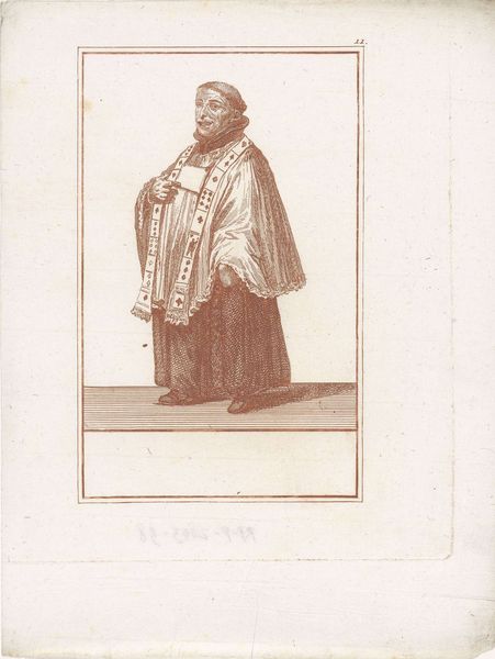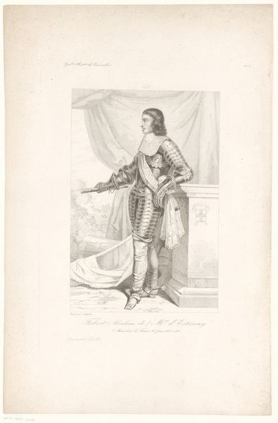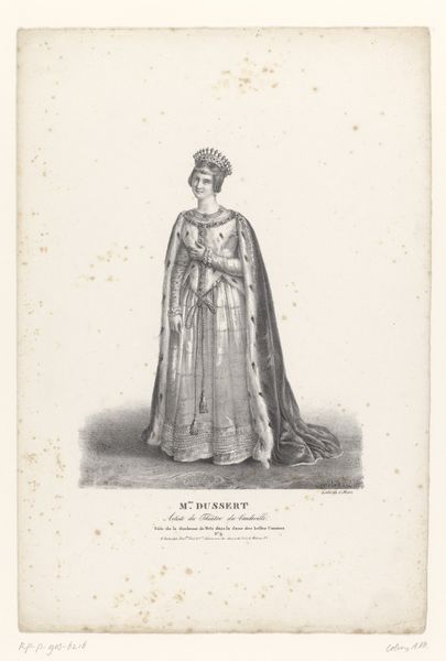 Alexandre-Marie Colin created this print of Marie Bras as Dame Catherine, using lithography. The figure of Marie Bras dominates the composition with her presence both regal and serene. The artist's use of lithography captures a rich interplay of light and shadow, lending depth and texture to the portrayal of her elaborate costume. Her garments, draped and detailed, serve not only as a marker of status but also echo structural themes present in theatrical performance. The lines of the composition draw our eyes upward, to her gaze and simple headpiece, imbuing the figure with a contemplative air. In semiotic terms, Marie Bras as 'Dame Catherine' becomes a signifier of both historical and fictional narratives, inviting viewers to interpret how representation can shape our understanding of identity and history. This print invites us to consider the fluid boundaries between performance, representation, and identity, reminding us that the meaning of an artwork lies in its dynamic interaction with its viewers and cultural context.
