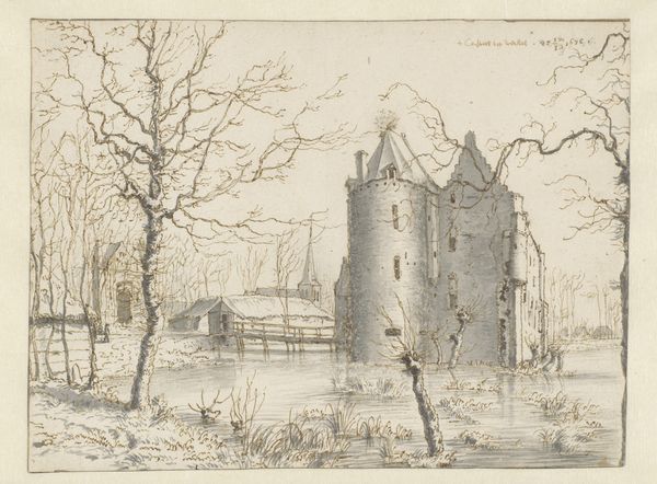 Curator: This unassuming sketch of Kasteel Frisselstein, rendered with delicate pen strokes on aged paper, is attributed to Valentijn Klotz, and was possibly made in 1676. What's your immediate reaction? Editor: My initial impression is of quietude and isolation. The bare trees, the still water surrounding the imposing structure, it feels almost melancholic, like a fairytale castle slumbering in winter. Curator: Precisely. Klotz really captured the feeling of solitude that these moated castles often inspire, the detachment, not just physical, but historical and even spiritual, maybe. It is really compelling. What do you make of his technique? Editor: I find it intriguing how he's used the ink washes to suggest volume and light on the castle walls. The drawing gives us insight into 17th-century land ownership and class structures, these architectural marvels embodying the power of elite families and their deep connections to the land, right? Curator: Right. I think what strikes me most is that it really feels like a quickly executed field sketch—the sort of thing a wandering artist or nobleman might have captured in a personal sketchbook as a visual reminder of his place in the world. A souvenir from his travels through his holdings, so to speak. Editor: And look at how that historical positionality manifests within this seemingly objective landscape depiction. By framing this isolated and enclosed fortress within the rawness of nature, it raises questions about man’s control over the environment and the justification of this ownership. Curator: Absolutely, especially since, considering the timeframe, it seems unlikely the servants or inhabitants of the area would have had similar freedoms to capture such an image. One sketches the surroundings and the other has to live and cultivate it—two vastly different viewpoints shaped by privilege. Editor: Which emphasizes the crucial role artists play, often unknowingly, in recording both what is present and what is actively missing within society. In rendering the view, the act itself becomes laden with broader sociopolitical significance. Curator: I'll definitely ponder this image of Frisselstein differently from now on. So much power hidden in such a quiet, humble sketch. Editor: Exactly, and as it happens the seeds of change are often sewn in the quietest of moments. It feels rather pertinent today, don't you think?
