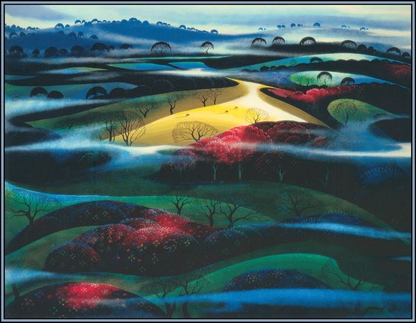 Editor: Here we have Eyvind Earle's "Summer's Twilight," created in 1998 using acrylic paint. There's something about the almost flat rendering of the landscape that gives it a surreal, dreamlike quality. How do you interpret this work, especially given its historical context? Curator: I see it as a powerful comment on environmental concerns masked as an idyllic scene. Earle’s hyper-stylized landscapes often present a carefully constructed, almost artificial view of nature. The sharp lines, the regimented trees, the unnaturally vibrant colors – these choices highlight a tension between nature and humanity's idealization of it. Editor: That's fascinating. I hadn’t considered the artificiality as a critical element. Curator: Think about it: the late 20th century saw a surge in awareness of ecological damage. Earle, working within the Post-Impressionist tradition, uses beauty to lure us in, but then disrupts that beauty with an almost unsettling precision. It’s not a straightforward celebration; it's a conversation. Where does nature end and our manipulated perception of it begin? Does this pristine scene acknowledge who has the social capital to retreat to it? Editor: So you're saying it's a commentary on privilege and the manufactured image of nature that the wealthy are prone to enjoying? Curator: Precisely. And even perhaps indicting that very privilege, the way resources are controlled and how specific environments and ecologies are framed or presented. Editor: I'm beginning to see so many new layers that I missed at first glance. Curator: That’s the beauty of engaging with art through a critical lens. It pushes us to question not just what we see, but why we see it that way, and who benefits from that particular vision. Editor: Thanks! This has completely changed my understanding of Earle's work. Curator: Mine too. It's the dialogues around power and representation that make these landscapes really come alive for me.