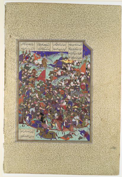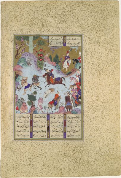 Editor: Here we have "The Combat of Rustam and Ashkabus," a vibrant watercolor painting created sometime between 1500 and 1555, illustrating a scene from the Shahnama. The dynamic figures and ornate details caught my eye. How do you read this scene within its cultural context? Curator: This miniature isn’t simply illustrative; it’s deeply enmeshed with the political and cultural aspirations of its patron, Shah Tahmasp. The Shahnama itself was a crucial text for solidifying Persian identity. But what strikes you about *how* the narrative is presented? Editor: Well, it’s full of action, figures seemingly frozen mid-battle, but there’s also an artificiality to the space... it feels staged somehow. Curator: Exactly. The composition emphasizes power and order. Even in the midst of conflict, there’s a sense of divine right, a visually imposed hierarchy. Consider the rich detail – not just decorative, but reinforcing a specific image of Persian power for an elite audience. The placement within a royal manuscript also elevated the status of both the patron and the art. What do you make of that relationship? Editor: So, it's not just a depiction of a battle but a careful presentation of royal authority using the cultural power of the Shahnama narrative? The details, composition, even the very act of commissioning such a work, were all politically charged? Curator: Precisely. And in turn, the historical importance of the Shahnama continues to bolster cultural values today. What’s your overall take away now? Editor: It's more complex than a pretty picture; it's an important record of political power, patronage, and solidifying Persian identity! Curator: Indeed, a reminder that art is rarely created in a vacuum; understanding the historical and social forces at play reveals a wealth of meaning.