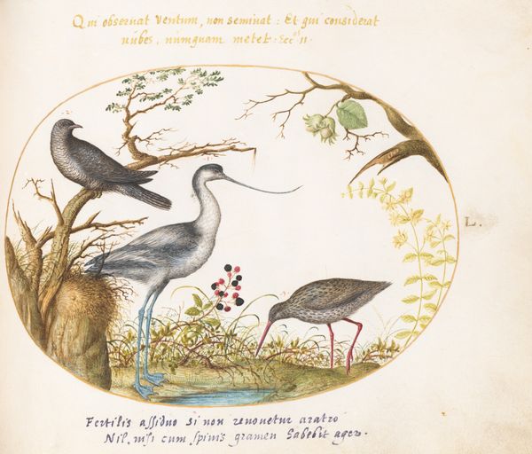 Joris Hoefnagel created Plate 19: Two Great Egrets with Green Breeding Masks in the late 16th century. Hoefnagel was a Flemish artist working at a time when scientific illustration was rapidly developing. In this watercolor and gouache painting, he combines his precise observations of nature with the aesthetic conventions of his time, resulting in a work that straddles the line between scientific document and artistic creation. The egrets, depicted with meticulous detail, are set within an oval frame, a common stylistic choice during the Renaissance. Hoefnagel's work reflects a growing curiosity about the natural world, fueled by exploration and trade. But it's worth considering how this curiosity intersected with colonial expansion. The desire to classify and document nature was often intertwined with the desire to control and exploit it. These birds become emblems of a world being cataloged, possessed, and changed forever. Consider how the emotional resonance of these images persists, reminding us of the complex relationship between humans and the environment.