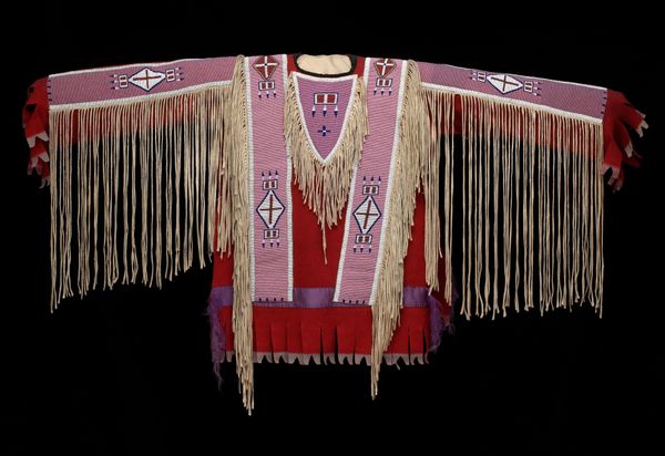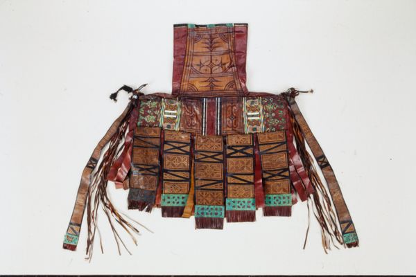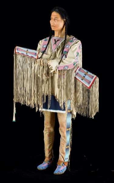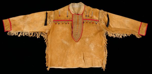 Curator: This is a Girl's Dress from circa 1860-1870 by an unknown Tsistsistas (Cheyenne) artist. The piece resides here at the Minneapolis Institute of Art and consists of fibre-art such as textile and weaving techniques. It's striking to see such delicate beadwork on what I imagine would have been a well-worn garment. What are your first impressions? Editor: It's beautiful. I'm struck by how tactile it feels, even just looking at a photo. All that fringe and the subtle coloration… It evokes a sense of history and tradition. But what would the significance of these textiles mean within its own time and location? Curator: The symbolism is incredibly rich, speaking volumes about cultural memory and identity. Consider the use of beads, their colors, their arrangement… Do they remind you of any other cultural symbols you may be familiar with? Editor: The geometric patterns near the neckline and hem are particularly eye-catching. It reminds me a bit of certain styles of weaving, yet adapted with available resources such as beads and the type of leather. How do you interpret these visual motifs? Curator: Precisely! The geometric designs aren’t merely decorative. Think of them as embodying stories, beliefs, perhaps even maps of their world. Certain shapes might represent natural elements, familial connections, or spiritual concepts integral to Cheyenne life. Does understanding this change how you view the work? Editor: Absolutely. It makes me consider the dress not just as clothing but as a powerful medium of communication and cultural preservation. There's a whole language encoded within its fibers. Curator: And think about the act of creation itself – the hours spent crafting, beading, passing down techniques. The dress embodies intergenerational knowledge and cultural continuity. Editor: This has truly deepened my appreciation for the piece. I initially saw a garment, but now I see a profound expression of identity. Thank you!