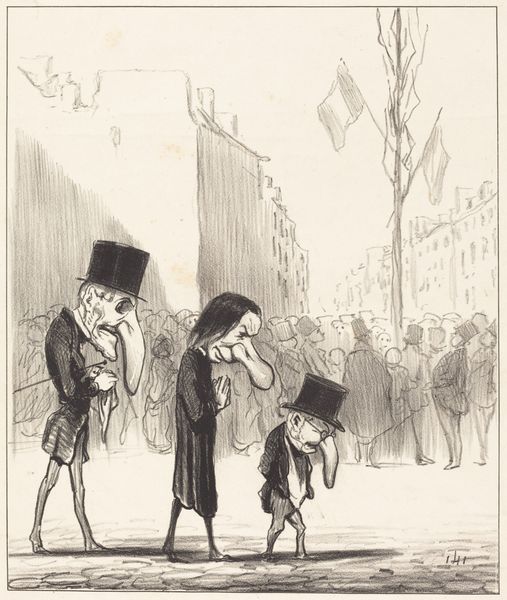 Curator: Looking at this lithograph, titled "Tiens, voilà un écriteau que ma femme a passé..." created around 1848 by Honoré Daumier, my immediate reaction is to consider the narrative. It seems tinged with societal commentary, perhaps poking fun at domestic dynamics of the time. What do you think? Editor: Well, the most striking element to me is how stark and somewhat grim the lines are; there’s a harshness in the rendering of the figures and the urban environment, emphasizing the societal issues of that time. The title roughly translates to "Look, here's a sign my wife passed..." which feels charged with subtle gendered conflict right off the bat. Curator: That interplay, that marital dynamic, is key. I'm drawn to how Daumier uses visual cues—the husband’s posture, the wife slightly behind him, the stark announcement poster they’re observing. These aren't just characters; they're symbols of the relationship. Do you think it plays with ideas of patriarchy, with an underlying hint of rebellion? Editor: Absolutely. We're presented with these very specific roles that speak volumes. It is a time capsule of social hierarchies; we see an urban landscape deeply marked by gender inequality, and probably, if one examines Daumier's other work, class struggle too. Her action, the posted sign, feels quietly subversive, asserting some form of agency. Curator: It's fascinating how Daumier distills a whole power dynamic into a simple street scene. It seems to represent the invisible load many women carried and continue to carry. The heaviness and shadows within the line work seem to be reinforcing that load. Editor: Precisely, and beyond just the interpersonal dynamics, the artwork feels acutely relevant, reflecting persistent societal power dynamics. Even something as everyday as walking through the city, a married couple seeking an apartment, turns into an enactment of social issues. There is some universality here in that sense. Curator: Thinking of symbols, I feel the poster in the scene has the weight of a societal pronouncement or decree, with the figures arranged underneath, responding to its command. It really allows one to delve deep into questions of societal memory through the work. Editor: Yes, the city is a stage, and they're players caught in its narrative, each move laden with meaning. Curator: Ultimately, what stands out is Daumier's skill in using everyday observations to unveil so much beneath the surface. The subtle nuances he uses make you reflect about societal constructs of past and present. Editor: And it reminds us that even simple encounters can reveal deep-seated issues, and perhaps even spark social change. It is important to reflect on those themes.