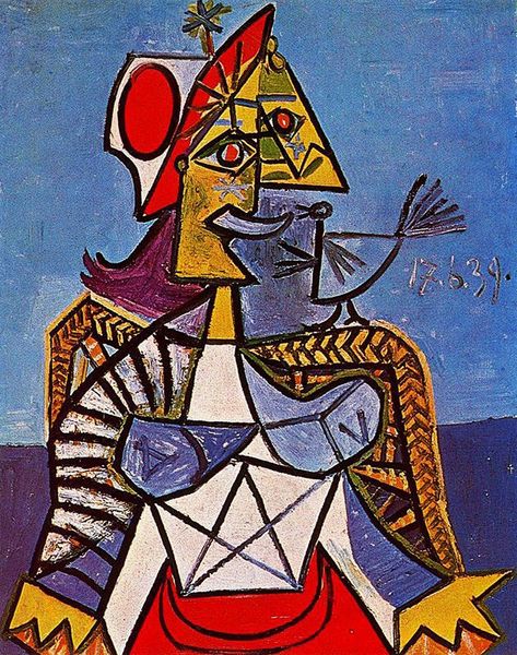 Picasso painted this "Seated Woman," with oil on canvas; it's now at the Hermitage in Russia. Look at the way he's sliced up the figure into geometric shapes, like he's building her out of cardboard boxes. The color palette is a warm, earthy mix of browns, oranges, and yellows. He wasn't trying to copy what he saw, but instead capture an emotional truth. You know, how we're all made up of different angles and perspectives. Check out the lines around her legs. See how they define her shape, but also feel kind of arbitrary? Picasso's letting us in on the secret of painting: it's not about perfect representation, it's about invention. It makes me think of Cezanne, but also of Leger, or maybe even Guston later on. It's like art is one big conversation, and Picasso is just adding his voice to the mix.