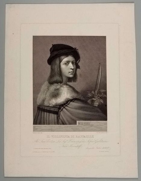 Editor: This print by Johann Friedrich Müller depicts Raphael Sanzio at 23. It's a striking portrait. What can you tell me about its context? Curator: It’s interesting to consider how portraits like this shaped Raphael’s public image. This print, likely made well after Raphael's death, participates in the construction of the artist as a genius. How do you think its circulation affected his reception and legacy? Editor: That's fascinating. It reframes my understanding, thinking about how images like this contribute to a carefully crafted art history. Curator: Exactly. It encourages us to question the forces behind the narratives we often take for granted.