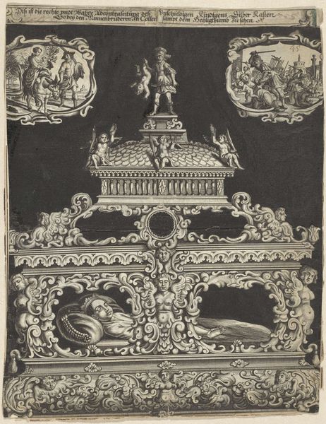 Daniel Marot the Elder created this print, *Oeuvres du Sr. D. Marot*, in the late 17th or early 18th century. The print's intricate composition and stark black and white contrast draw you into a world of highly stylized interior design. Marot meticulously details a room dominated by ornate decorations. The patterned wallpaper, framed pictorial panels, and elaborately adorned fireplace create a scene of organized complexity. The detailed execution demonstrates Marot’s understanding of form and composition. The use of symmetry, combined with narrative scenes, establishes a dialogue between order and representation. The semiotic system at play is rich, blending classical motifs with emerging tastes for chinoiserie. This fusion reflects the cultural codes of the period, marked by an embrace of the exotic filtered through a distinctly European lens. The print isn't merely a depiction but a statement, inviting viewers to consider how spaces shape identity. Ultimately, the rigid structure, with its repetitive patterns and balanced forms, embodies the era's quest to reconcile artistic expression with intellectual order. It challenges us to consider the layers of meaning embedded within design.
