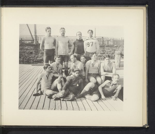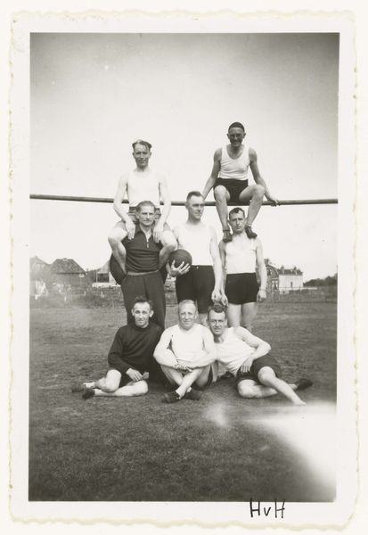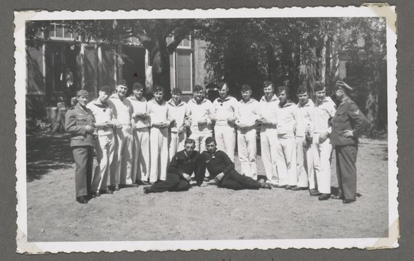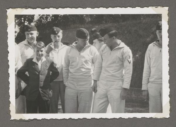 This photograph, taken by an unknown artist, captures a group of soldiers at a football match, officers versus the enlisted men, sometime in the past. It’s a humble snapshot, a moment captured, not labored over. The charm of this image lies in its candid nature, in the way it lays bare a specific moment in time. The monochromatic palette lends it a timeless quality, as if the scene could exist in any era. Look at the way the light catches the faces of the young men, revealing their varying expressions, from amusement to exhaustion. The grainy texture adds to the sense of immediacy, as if we're right there on the sidelines with them. The composition is informal and intuitive, much like a painting by someone like Philip Guston. There is a sense of balance in the arrangement of the figures, but the image is more concerned with capturing the spirit of the moment. It’s not about perfection, but about the feeling of camaraderie and the simple joys of a day at the match. This embrace of imperfection makes it all the more compelling and relatable, reminding us that art, like life, is an ongoing experiment, a series of happy accidents and unexpected discoveries.