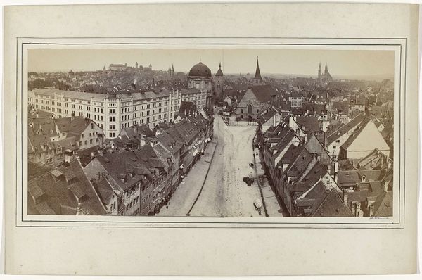 Editor: Here we have "Gezicht op Bamberg en de Michaelsberg, Duitsland" – or "View of Bamberg and the Michaelsberg, Germany" – a gelatin silver print dating from sometime between 1860 and 1890 by S.P. Christmann. I’m struck by the way the gelatin silver print renders such sharp detail – almost like an etching, capturing the cityscape with a focus that is quite unique for the period. What stands out to you? Curator: Well, immediately, I consider the photographic process. A gelatin silver print meant a mass-producible image; look at this not just as art but as a commodity. What kind of labor went into creating multiples of this image, capturing a quaint view? What socio-economic conditions made the creation and consumption of this photograph possible? Consider the silver itself. Where was it mined? Who profited from its trade? The materials dictate how the scene itself might be perceived, don't you think? Editor: I suppose it does reframe my perspective on it – the photo doesn't feel so timeless when you think of it as the end product of extensive labour. Is the specific choice of silver-gelatin important to its meaning beyond its reproductive capabilities? Curator: Precisely! Its affordability increased access. People, far removed from the depicted scenery, could engage in a tangible form of tourism. The print bridges distances but also makes one reflect upon what these distances mean from a social perspective. And if we were to compare a more expensive medium for the time like platinum or albumen would it change its context? Editor: I hadn't considered how much the very materials affect not just the look, but the *meaning* of the artwork itself, and its relation to wider culture and labour practices. Thank you! Curator: Of course! Seeing art through the lens of materials reveals how deeply intertwined artistic production is with broader social and economic forces.