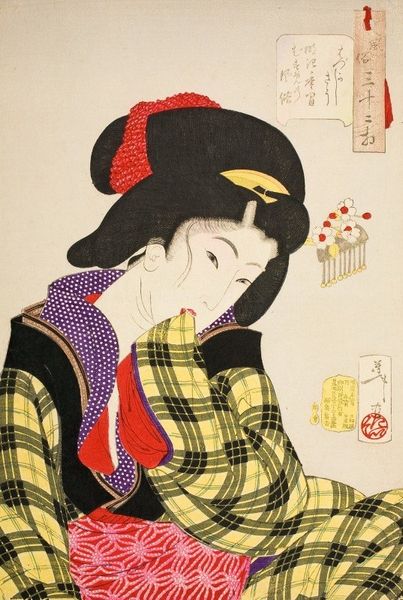 Curator: The artwork we're observing is a woodblock print by Tsukioka Yoshitoshi, created in 1888. It’s entitled "Looking Shy - The Appearance of a Young Girl of the Meiji era." Editor: It has a rather melancholic quality, wouldn't you say? The heavy lines, the girl’s averted gaze… There's a stillness and quiet sadness that is very present here. I find it almost stifling. Curator: That melancholic mood, I think, speaks to the transitional period of Meiji Japan. Yoshitoshi often grappled with themes of cultural shift, and this portrait could be interpreted as a commentary on the changing roles and expectations placed on young women at the time, caught between tradition and modernity. Editor: The very textiles she wears reflect that tension! Look at the elaborate hair ornaments juxtaposed with the quite loud, almost clashing patterns of her robes. The fabric is clearly machine-made, unlike traditional garments that would have been woven entirely by hand, by individual artisans and cottage industries. Curator: Exactly. Considering the historical context, the artist likely selected these details deliberately. The girl’s posture and downcast eyes, coupled with the mixing of traditional and modern fashion elements, invite us to consider the complex negotiations of identity in Meiji society. Was it a deliberate commentary by Yoshitoshi on gender roles during modernization, given his awareness of social issues and perhaps proto-feminist attitudes? Editor: I agree, the work certainly makes us question access to material, class and generational expectations. One can almost sense the weight of her garment; heavy cloth laden on a child—how many hours went into producing that print, and by how many people? And for what end use? How much of that labor reflects power, how much simply a process for sales and economic benefit? Curator: Absolutely. By analyzing Yoshitoshi’s artistic choices and acknowledging the era's historical pressures, we gain insight into a moment of upheaval—a visual document expressing the anxieties and ambivalences of a society undergoing massive transformations. Editor: Yes, considering the process, labor, and sheer volume of work, both in raw materials and artistic creation, in connection with the societal flux, renders it a striking snapshot of Japan’s evolving identity. It truly gives us pause.