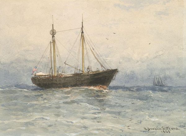 Curator: Painted in 1867, Ivan Konstantinovich Aivazovsky's "Sea" is a profound exploration of maritime power and the sublime. It’s an oil-on-canvas rendering that captures the raw energy of the water. Editor: Immediately, what strikes me is the diagonal composition. The ship caught in the foreground wave seems precariously balanced, almost a formal exercise in tension and release against the backdrop of an angry sky. Curator: The Romanticist roots are definitely evident here. Aivazovsky, as the foremost Russian marine painter, uses the seascape not just as representation but as a symbolic space. His seascapes are never empty. Editor: The colour palette too seems highly intentional, doesn't it? That constrained range of grays and blues broken only by the warm ochre of the wave crests – almost like a commentary on tonal unity, yet full of internal tension. Curator: He also served as the official artist of the Russian Navy, lending political dimensions to these powerful canvases. Think of Russia's imperial ambitions visualized. What's the role of art in that public demonstration of power? Editor: Fascinating point! The dynamism could be read through that lens: the formal arrangement mirrors how a nation like Russia would want to project itself: the sheer force against an opponent on the global stage, always moving forward, as suggested by that secondary ship in the background. Curator: Exactly. Furthermore, notice how the sky isn’t a pure backdrop but has that luminosity achieved by very thin glazing. Consider how he mastered painting light… the formal aspects served propagandistic roles within the socio-political context. Editor: His brushwork has a textural language. Observe the crests of those waves – there is painterly gestural quality that contrasts to the industrial feel of the ships, but yet ties the piece together formally through texture. A beautiful dialogue in paint. Curator: Aivazovsky's "Sea" reminds us how much art serves not just visual delectation, but also broader ideological needs within any society. Editor: For me, it’s a prime example of how formal elements like composition and color interact to create and magnify emotional impact—truly an unforgettable artwork to ponder.