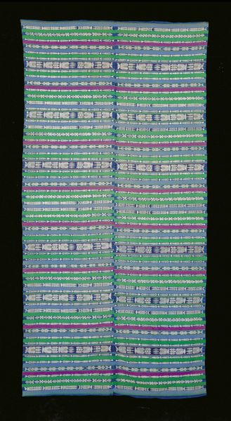 Curator: Up next, we have an intriguing textile piece identified as simply "Panel," of Yoruba origin, dating back to around the 20th century. It's part of the collection here at the Minneapolis Institute of Art. Editor: It feels so orderly, doesn't it? The lines are incredibly steady, precise. But the color scheme also speaks to a quiet elegance; not showy, more a considered composure. Almost meditative. Curator: Absolutely. Constructed with silk, cotton and other fibres, this panel showcases a remarkable level of craft. When we think of fibre art, it’s important to remember how it has long served not just functional, but also expressive and symbolic purposes, particularly across many cultures. The regularity you noted is central to understanding its significance. Editor: How so? I mean, the way those linear forms seem to repeat—it makes me consider, naturally, the labor, time, and potential social function, the context for weaving. Also the pattern seems to integrate written phrases or words of sorts into the textile. Is there information available on the process of weaving that would better reveal insight into labor concerns? Curator: We believe the text within is devotional in nature; the act of weaving became, itself, a form of spiritual dedication, each repeated phrase imbuing the textile with power and prayer. You've also highlighted a critical tension: while the finished piece conveys elegance and refinement, the physical act of creation, the hours poured into each thread, carries a story of often undervalued labor. The contrast makes you reflect upon the historical and social aspects in production, as well as potential uses within private/public/religious life. Editor: It does beg that question of labor… the inherent worth we assign to painstaking craftsmanship, and who gets to define “art.” Thinking materially also gets me pondering its original intended application: Was it apparel? Decoration? Does this panel reveal cultural identity? Or perhaps religious beliefs? It appears delicate but substantial. Curator: Perhaps the true beauty lies in that quiet subversion—elevating the everyday through devotion and craft. The “Panel” invites us to see the sacred woven into the fabric of daily life. I find myself pondering who the weaver might have been. A master of the form. What a statement about Yoruba resilience. Editor: And to appreciate the subtle artistry, acknowledging the materials themselves, in cotton and silk, along with the intensive weaving that transforms simple fibers into complex messages.