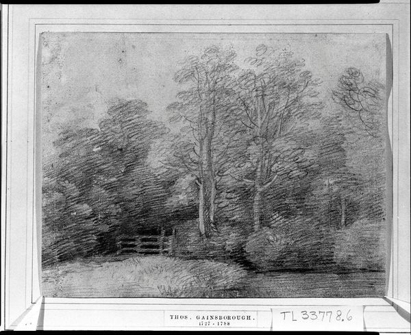 Curator: William Trost Richards' drawing, "Landscape with Trees," presents a serene vista in charcoal. It resides here at the Harvard Art Museums. Editor: My first thought is how melancholy it feels. The muted tones, the stark trees...it evokes a deep, quiet solitude. Curator: Richards, active during the late 19th century, often depicted landscapes to evoke spiritual or emotional states. What sort of cultural associations do you think viewers might bring to such imagery? Editor: The Hudson River School comes to mind. It promotes a specific vision of America's natural bounty, often subtly reinforcing notions of westward expansion and national identity, even in seemingly simple scenes. Curator: Precisely. And the trees themselves, as archetypal symbols of nature and growth, invite introspection. Their starkness here might even suggest a certain vulnerability. Editor: Indeed, Richards offers more than just a landscape; he delivers an invitation to contemplate our relationship with nature and its representation. Curator: A contemplative scene, shaped by its time and open to ongoing interpretation.