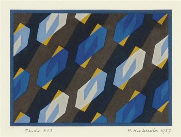 This is Studie 247A, made by Hans Hinterreiter in 1950. It looks like it was made with colored inks, and perhaps gouache? Either way, it's a game of shape and color. The colors are muted, almost earthy. And the way the shapes lock together reminds me of a puzzle. Look closely, and you'll see that the shapes aren't perfect. There's a bit of wobble and imperfection that gives the whole thing a handmade feel. Check out the way the colors bleed slightly at the edges of the shapes - a deep ochre, a sky blue, a rust red. It's not about perfection but about the joy of playing with color and form. Thinking about it, it reminds me of the work of Hilma af Klint, or even some of the Bauhaus artists, folks interested in how geometry and color can create a sense of harmony and balance. It's a beautiful thing, this little study!
