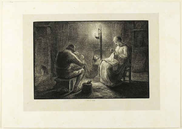 Adolph Kittendorff created this diminutive drawing, "Vinteren," using pen and ink. The composition is dominated by contrasting textures and forms; notice the soft, flowing lines defining the figures of the mother and children, which juxtapose against the stark, rigid structure of the stove. The artist’s careful use of hatching creates depth and shadow, drawing our eye to the implied warmth emanating from the stove's small window. The stark contrast between light and shadow is not merely representational but functions structurally, highlighting the psychological space between the figures and the implied exterior world. Through this, Kittendorff subtly explores themes of shelter and domesticity, using the visual elements to underscore a deeper narrative about the human condition. In essence, the drawing's power lies in its formal arrangement, creating a narrative space that resonates with broader cultural and philosophical ideas about home, safety, and the elemental struggle against the cold.