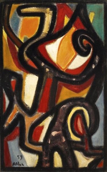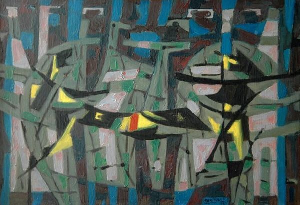 This is Andre Lanskoy’s “Composition,” made in 1973 using what looks like pastel or maybe oil stick. See how the strokes are laid down flat, not blended? It's all about the gesture, the making. Up close, the surface has a gritty texture, like the pigment was pushed into the paper. The colours are bold—red, blue, green—bouncing off each other. There is a certain lack of depth or perspective that flattens the image, which makes the colours really pop. Take that thick white line snaking through the centre, for instance: it doesn't describe a form, but it creates a bright energy that holds the whole thing together. Lanskoy’s work reminds me of the Russian avant-garde, maybe someone like Kandinsky. It’s about feeling, not seeing, a total commitment to the possibilities of abstract form. I feel like his paintings are an invitation to dive into the unexpected.