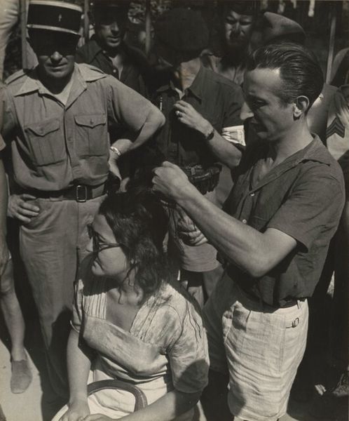 Editor: Here we have Constance Stuart Larrabee’s "Untitled (Collaborators, St. Tropez, France)," a gelatin silver print taken after 1944. The stark black and white tones create an incredibly somber mood, particularly given the close-up perspective of the distressed subject. What stands out to you from a formalist perspective? Curator: The composition is indeed striking. Note how Larrabee employs a shallow depth of field, isolating the figures from their immediate context. The sharp focus on the textures – the patterned shirt, the coarse fabric obscuring the face, even the shorn hair – invites a tactile reading. This materiality emphasizes the raw human experience. How does the restricted palette influence your reading? Editor: I think the lack of color intensifies the feeling of rawness, and also lends a timeless quality to the photograph, almost as if the emotion transcends a specific place and time. I wonder if there's something to be said for the repetition of patterns and shapes, between the checked shirt and the polka-dotted cloth. Curator: Precisely. The geometric tension created by these repeating motifs contributes to the overall visual unease. Think of structuralist interpretations of binary oppositions: order versus disorder, seen in the contrast between the crisp lines and the obscured face. Moreover, observe how the gaze is directed inwards, denying the viewer any direct access to the subject’s emotional state. Editor: So, by analyzing these formal elements – the composition, the textures, the contrast – we can start to unpack some of the deeper meaning in this work? Curator: Exactly. We move beyond a purely emotional response and delve into a systematic understanding of how these elements construct meaning within the photographic frame. Semiotics would examine how that cloth operates as a signifier, simultaneously concealing and revealing vulnerability. Editor: I see. It's much more than just a snapshot of a person crying. By looking closely at the forms, we can uncover deeper layers of meaning and intent. I never really thought of the geometric tension of a picture having so much power. Curator: It is through this meticulous attention to form and structure that we access the essence of the work and the profound power it wields.