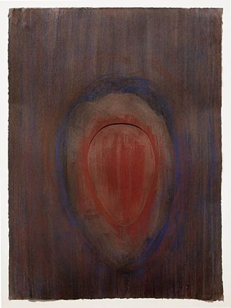 Editor: This is Anish Kapoor's "Untitled 5" from the Tate Collection. It's a dark and intense image dominated by a central red form. What do you see in this piece? Curator: I see an ancient echo, a visual metaphor for the origin, both primal and sacred. The red suggests blood, passion, and life force. Consider the cave paintings where red ochre marked the beginning of symbolic thought. What feelings does it evoke? Editor: It feels… intimate and a little unsettling, like peering into something forbidden. Curator: Precisely. Kapoor often explores voids and openings, symbolizing entry into the unknown. This image carries that cultural weight, recalling creation myths and our collective unconscious. It's interesting how colour carries symbolism across various cultures. Editor: I never thought about it that way. Seeing art as a vessel for shared cultural memories is a powerful idea. Curator: Indeed. Art is where the past speaks to the present, shaping our future perceptions.
