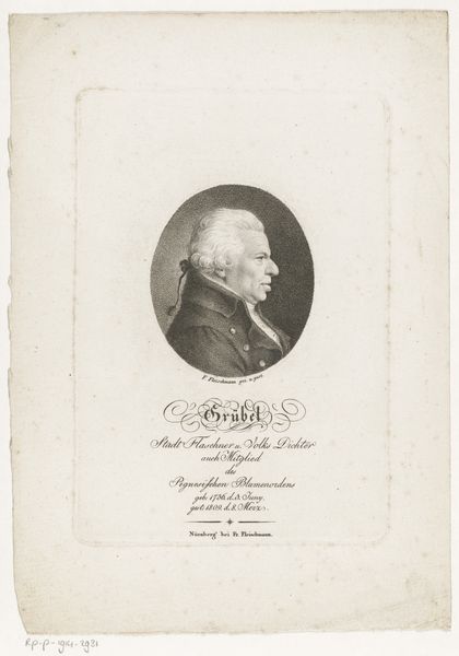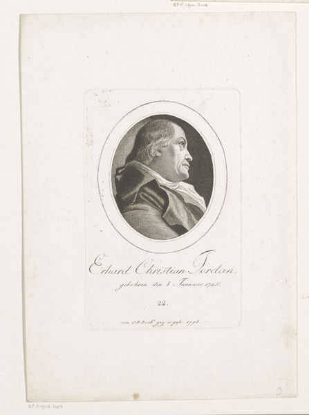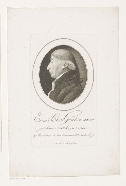 Here is the audio guide script: This is a portrait of Johann Andreas Schmidhammer by Christoph-Wilhelm Bock. Note the stark contrast of light and shadow achieved through precise engraving on this small print. The subject is encased in a rounded frame, typical of portraiture of the time. The composition directs our gaze immediately to Schmidhammer's profile, sharply rendered with clear lines. The artist uses hatching and cross-hatching techniques to model the form, creating depth and volume. Schmidhammer’s wig and attire, symbols of status, are meticulously detailed, reflecting the subject’s professional standing as a ‘mercator’ and member of the Drawing Academy in Nuremberg. Consider how the artist used line and form to not only capture a likeness but also to convey social information. The meticulous rendering and formal arrangement speak to Enlightenment ideals, where reason and order were reflected in art as much as in society.