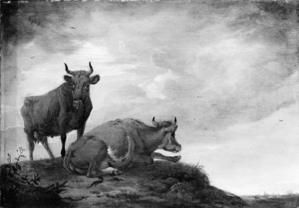 Editor: Here we have "Et kvægtykke", or "A Cattle Piece," from the 1820s, by Christian David Gebauer. It's quite a striking piece, all in monochrome, giving it a somewhat dreamlike quality. What's your take on it? Curator: Oh, dreamlike is spot on. I’m immediately struck by how Gebauer captures the stillness. It's more than just cows in a field; it's an almost meditative observation of pastoral life. The monochrome palette definitely amplifies the emotional tone, don't you think? What do the cows suggest to you? Editor: They seem really calm, like they’re posing or lost in thought! I guess the contrast kind of reminds me of early photography. Curator: Exactly! This was the Romantic era so you have both the stirrings of Realism showing life in a recognizable way and also the drama of light playing on our emotions. If you think of moonlight on a field, its emotional punch. I also love that Gebauer is inviting us into a quiet moment. But how does it make you *feel*? Editor: It feels simple. Almost nostalgic. Looking at it, I start wondering what life was like then. Did they also see beauty in something like cows grazing? Curator: That’s beautiful! And that, in essence, is what art does best. It takes us out of ourselves, lets us question, lets us feel deeply across time and perspective. Editor: That's so true! I hadn't thought of it that way before. I was so focused on the art historical aspect. Curator: Isn't that the best thing? Finding new layers, different pathways in. Now, next time you see cows grazing you might remember this little moment. Editor: Absolutely! Thanks for pointing that out. It's given me a completely different appreciation for genre paintings.