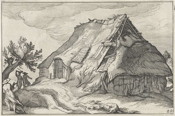 This print, "Farm with a yard and dilapidated barn," was made by Boëtius Adamsz. Bolswert, using a technique called etching. It's a process that relies on the corrosive action of acid to create lines in a metal plate, which is then inked and printed. Look closely, and you'll see how the fineness of the etched lines allows for incredible detail. The artist captures the rough textures of the thatched roofs and weathered wood, bringing out the rustic feel of the farm buildings. Notice the dilapidated state of the barn, revealing the underlying structure, a testament to the labor and materials involved in its construction. The image offers a glimpse into the lives of rural workers, with one figure carrying a basket on her head, highlighting the daily toil of agricultural life. Bolswert's skilled use of etching transforms a humble scene into a commentary on rural life, inviting us to consider the relationship between labor, landscape, and the art of making.