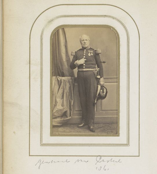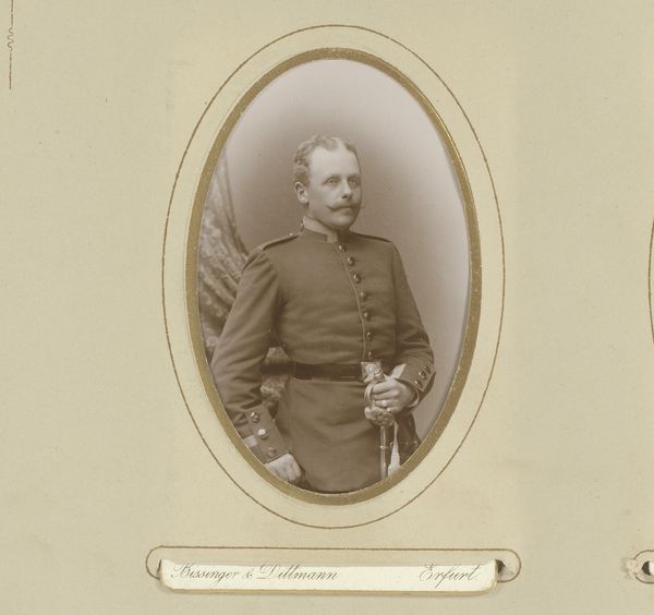 Albert Grundner created this small portrait of an unknown man in military garb, using photography, in the late 19th century. This image captures not just an individual, but also the codes and values of a society deeply invested in military power and masculine identity. Consider the semiotics of the military uniform, replete with insignias, each signifying rank, achievement, and belonging. The subject's posture, leaning casually on a chair, speaks to a performance of authority and ease within a structured hierarchy. In an era defined by nation-building and colonial expansion, the military uniform was more than mere clothing, it was a powerful symbol of national identity, of belonging to a select group entrusted with protecting and expanding the state's interests. This portrait compels us to reflect on the emotional and psychological dimensions of military service. What did it mean to embody the virtues of courage, discipline, and loyalty during this time? What pressures and sacrifices were involved in upholding such ideals?