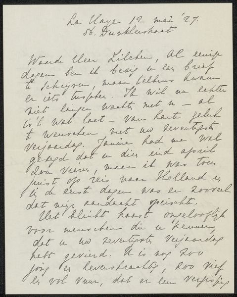 Here, Rose Imel wrote a letter to Philip Zilcken, probably in 1920, with ink on paper. The cursive script leans forward with a lively grace, and this reminds me that mark-making isn't just about describing something; it's about performance. The ink is dark, almost black, against the aged paper, and the lines vary in thickness, giving the writing a kind of rhythmic texture. Look at the way she forms her loops in the 'l's and 'e's, each slightly different, like a dance. You can imagine the movement of her hand, the pressure she applied to the pen. It makes you realize, letters aren’t just about conveying information; they're traces of a human presence. This letter shares a sensibility with Cy Twombly's scrawled, poetic gestures. Both show how art embraces the beauty of imperfection. It's this quality that keeps the conversation going.