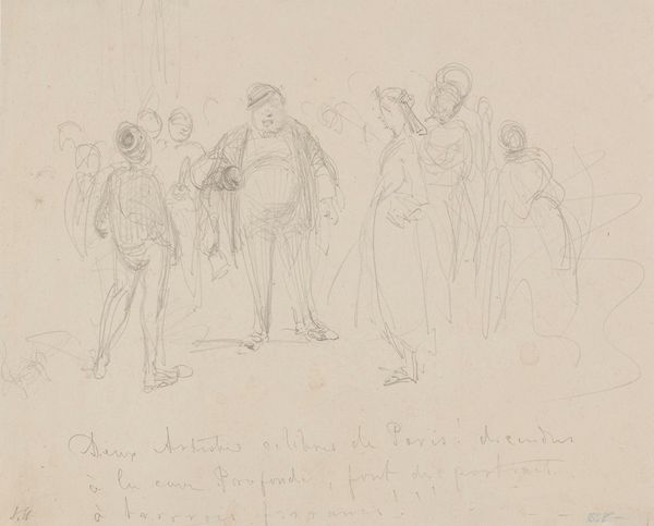 Editor: Here we have Peter Cramer’s pencil drawing, "Scene from The Merchant of Smyrna," dating from around 1726 to 1782. It has such a light, fleeting quality, like catching a glimpse of a performance. What strikes you about this piece? Curator: The title itself points us towards thinking about trade, but not just in the economic sense. Smyrna, now Izmir, was a melting pot of cultures and ethnicities. I'm immediately drawn to considering who is represented, and perhaps more importantly, who isn't represented in this "scene." What power dynamics might be at play, even in this seemingly simple sketch? Editor: So, you’re looking beyond just the surface depiction of a scene? Curator: Precisely. Rococo, the style it's labelled as, often depicted lighthearted scenes, but we can't ignore the colonial contexts intertwined with these portrayals. Notice how the figures in the foreground appear more distinctly rendered. Consider how that might relate to the artist’s own positionality and biases, and how this relates to the Western gaze upon "the Orient.” What stories might these less defined figures tell if they had more prominence? Editor: That makes me rethink the way I initially saw the drawing, it gives the sketch a new depth. It's a valuable reminder to question the narratives these images perpetuate and consider those voices that remain unheard. Curator: Exactly, seeing art as more than just aesthetic objects, but as active participants in shaping our understanding of history. Hopefully it’s a way forward towards a more equitable and critically conscious way of viewing art.
