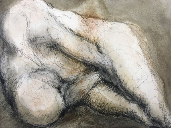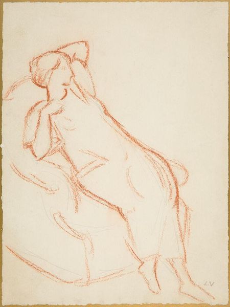 Curator: Edgar Degas created "The Bath" around 1883. It's rendered in pastel and colored pencil on paper, and remains in a private collection. What are your immediate impressions? Editor: Well, there’s a vulnerability that’s quite palpable, a sense of private moments captured in these broken strokes of colored pencils and pastel. It is definitely not something designed for the male gaze. Curator: Precisely. Degas often chose unconventional viewpoints, cropping figures and disrupting traditional compositions, and in doing so he challenged the very notions of the acceptable viewpoint and beauty. Note the dynamic asymmetry and high vantage point—we view the subject as if through a keyhole. What semiotic charge does that carry for the viewer, considering privacy and privilege? Editor: Indeed, this work exemplifies the rise of Intimism and its cultural focus during this time period on representations of private domestic life of bourgeois individuals, primarily women. And given the historical realities for many women during the 19th century—arranged marriages, constraints upon travel, lack of voting and educational rights—such a scene might not convey comfort. Rather, constraint. Curator: Absolutely. Degas also employed color as a structural element. Consider the way the blue of the tub is echoed and amplified by the ochre and white of the ground; they act as framing devices. Furthermore, we note that the planes of the ground tilt upwards, defying naturalistic space. It pushes the figure forward and compresses the pictorial field. Editor: Degas' later works like "The Bath" mark a profound evolution away from the conventional art sanctioned and privileged within the institutional salons and exhibitions in Paris, such as the Académie des Beaux-Arts. It really represents a movement towards increased experimentation in material use and imagery selection. Curator: His formal experimentation undoubtedly laid the foundation for successive movements. One can also draw lines through his subjects of modern, ordinary life directly into works such as the Ashcan School. Degas expanded painting's expressive potential. Editor: I agree. Seeing the composition through these lenses certainly helps to further articulate our appreciation and consideration of his place in modern art and art history.