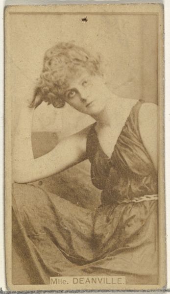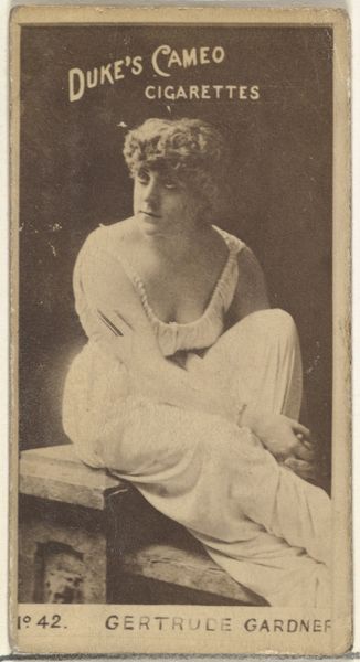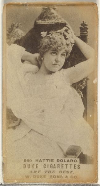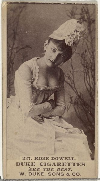 Curator: This albumen print, dating to the 1880s, is titled "Card Number 237, Rose Dowell, from the Actors and Actresses series," issued by W. Duke, Sons & Co. Editor: There’s a wistful air to this image. Her downward glance and slightly slumped posture, though posed, suggest a touch of melancholy, even resignation. Curator: Note how the light, despite being somewhat diffused, subtly models her face. It emphasizes the texture of her dress, allowing form to emerge primarily from tonal gradations. The backdrop, though blurry, provides just enough depth to set off her figure without drawing focus. Editor: It is also about how celebrity was consumed. An actress, elevated to a recognizable type, not so much for artistic talent as for marketable beauty. Cigarette cards immortalized performers, transforming them into collectable tokens. What a change from older ideas of art or patronage. Curator: The composition itself relies heavily on classical portrait conventions – the three-quarter pose, the soft lighting – but adapted for mass reproduction. Consider the limited tonal range; practical constraints related to the printing process had huge influence on the artwork's qualities. Editor: Dowell's elaborate hat and elegant gown denote status, reinforcing aspiration among the working class who purchased these cigarettes. But in turn, she becomes an emblem of the ephemeral: fame tied to fleeting pleasures. There's an implicit contract in play, wouldn't you say? Curator: The lines certainly become blurred between art, advertisement, and historical artifact. Editor: Exactly. Seeing the image in this way really enriches its surface. Curator: I quite agree. Focusing on form and function gives it another life altogether.