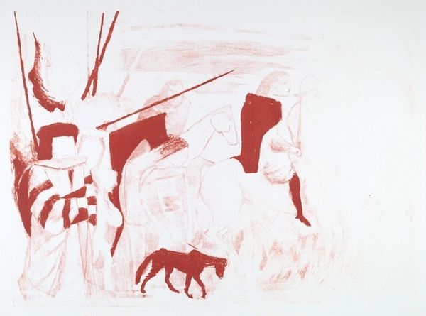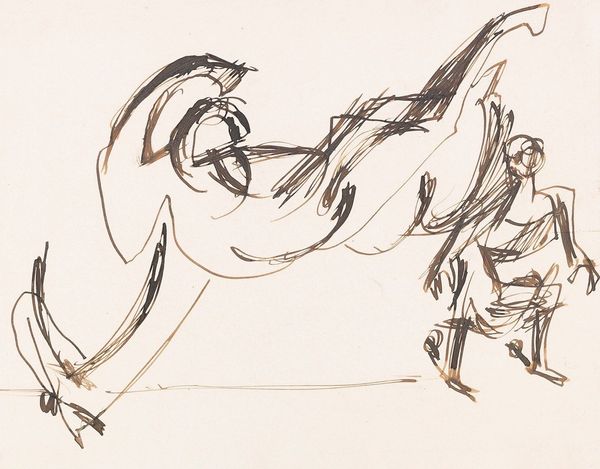 Editor: The vulnerability of this piece strikes me immediately. The washes of color create an ethereal yet raw mood. Curator: Indeed. What you are responding to, I think, is facilitated by the medium, watercolor, applied with seeming haste on a stark white ground. The artwork we're observing, "Street Workers in Snow," dates from between 1931 and 1933 and is by the Norwegian artist Edvard Munch. Editor: There's an unfinished quality that I find fascinating. Look at how the brown pigments literally drip down the page from the figures. I am really drawn to understanding what materials were accessible to him. Curator: I see what you mean. One might say the dripping contributes to a feeling of transient instability that challenges traditional modes of representation. It reflects an intentional disruption. Do you also notice the reduction of details within each figure, seemingly capturing only their primary movements and gestures? Editor: Exactly! We are not really supposed to see street workers at all. We get a sense of their toil—the stooping, the lifting, even the tools they use—and very quickly recognize the conditions they labor under. Curator: Munch is indeed adept at distilling labor and presence into something fundamental. It evokes a physical, almost haptic, response in the viewer. This work, even within its seeming spontaneity, speaks to a longer modernist project of pictorial reduction. Editor: Right, there is definitely that interplay. And while Munch may be drawing upon established approaches of his time, the texture—the feel of the watercolor seeping into the paper—also opens it up to various interpretations that might differ substantially from more "traditional" analysis. Curator: The negotiation of that historical legacy, that engagement with and subsequent departure from tradition, is what gives it such visual interest, wouldn’t you agree? Editor: Absolutely. It’s in those tangible traces, that sense of creation and work and presence—I think it opens the piece to all kinds of interpretations that extend far beyond what might be formally apparent.
