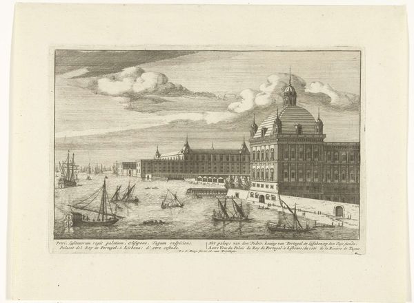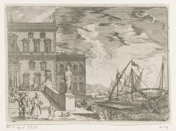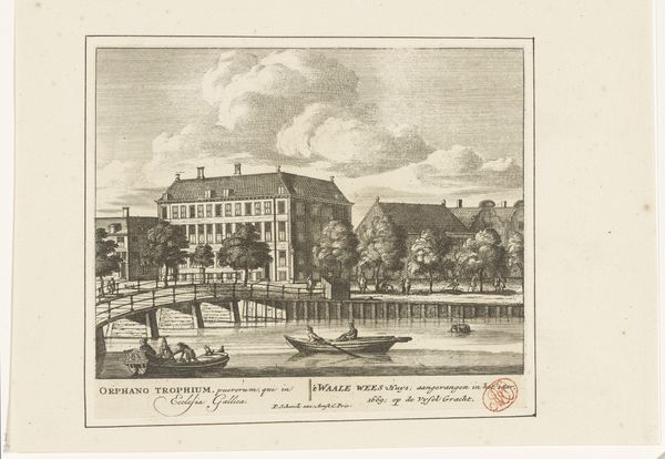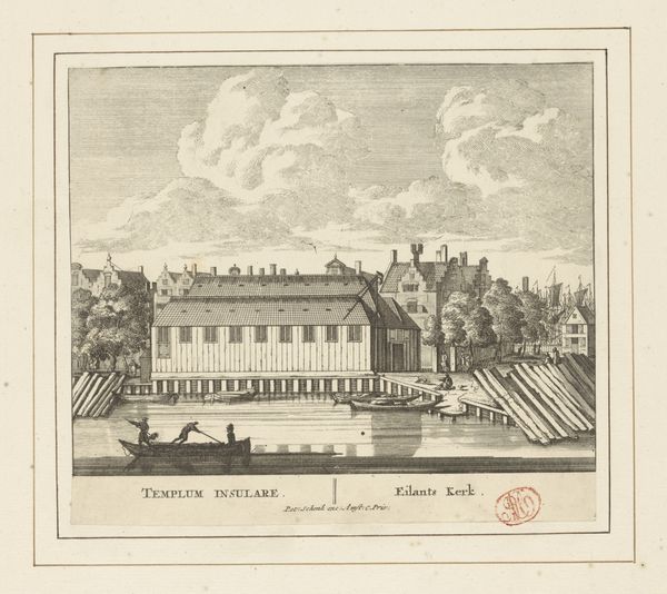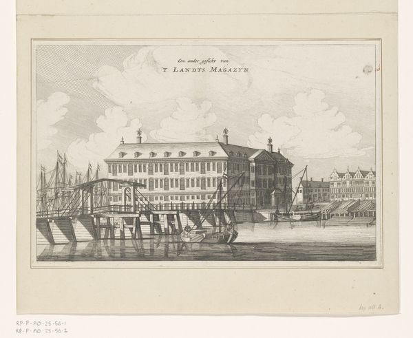 Here we have an anonymous rendering of the Nieuwe Stadsherberg etched in ink, presenting us with a vision of Amsterdam's evolving urban landscape. The composition focuses on the architecture of the Stadsherberg, flanked by waterways bustling with boats. Water, a motif of constant change and fluidity, mirrors the dynamic nature of Amsterdam as a hub of trade and cultural exchange. It’s reminiscent of ancient river deities, symbolizing not just physical sustenance but also the ebb and flow of fortune. Consider how this contrasts with, say, ancient Egyptian art, where the Nile represented cyclical rebirth and stability, a marked difference from the Dutch emphasis on mercantile opportunity. In the architecture, we can see classical elements—a calm façade with regular windows, a central door. These elements, harkening back to classical antiquity, were re-emerging during the Renaissance. It's a visual language used to invoke order, reason, and stability, projecting an image of civic pride and prosperity. The image presents a compelling interplay between the transient nature of water travel and the steadfast presence of architecture. The scene encapsulates a moment in time while simultaneously reflecting the ongoing historical processes that shape our cultural landscape.